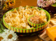 - Pour into a casserole dish. Sprinkle remaining cheese and 1/2 of Crispy Onions on top.